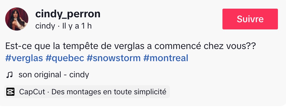 La créatrice de contenu Cindy a suscité de nombreuses réactions après avoir partagé sur TikTok son incompréhension face à la fameuse tempête de verglas annoncée un peu partout au Québec. Dans sa vidéo, elle raconte avec humour et étonnement comment elle s’est préparée à ce qui lui avait été décrit comme une tempête presque historique… pour finalement se réveiller devant un paysage parfaitement normal.