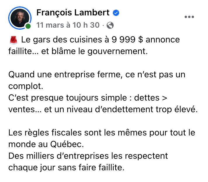 Les propos de François Lambert au sujet de la compagnie Armoires PMM soulèvent un débat important sur la responsabilité des entreprises lorsqu’elles font faillite. Dans sa publication, il affirme que la fermeture de l’entreprise n’est pas le résultat d’un complot ou d’un système injuste, mais plutôt d’une gestion financière déficiente où les dettes dépassent les ventes et où le niveau d’endettement devient insoutenable.
