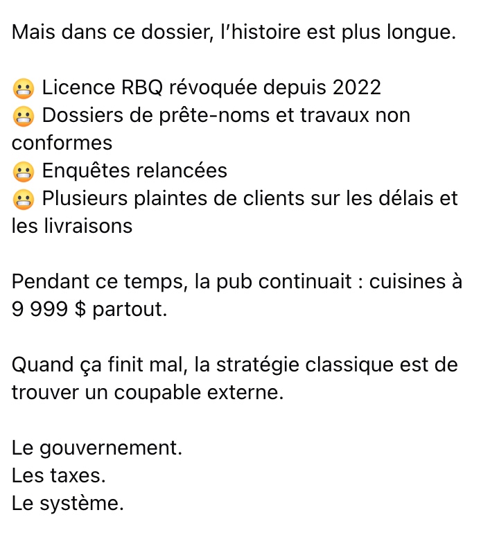 Dans le cas d’Armoires PMM, il rappelle également que certains éléments soulevaient déjà des inquiétudes depuis plusieurs années, notamment la révocation de la licence de la Régie du bâtiment du Québec en 2022, des enquêtes liées à des prête-noms et plusieurs plaintes de clients concernant les délais et la livraison des produits.