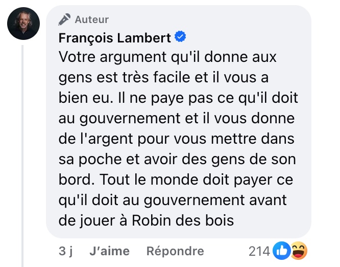 Il critique aussi l’argument voulant que l’entreprise redistribuait de l’argent ou aidait les consommateurs, en affirmant que personne ne peut jouer au « Robin des bois » sans d’abord payer ce qu’il doit à l’État. Selon lui, toute entreprise a d’abord l’obligation de respecter ses engagements financiers et légaux avant de se présenter comme un défenseur du public.