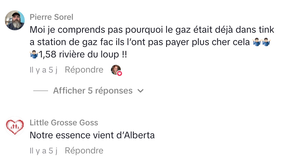Finalement, Carlie termine sa vidéo en disant que l’essence coûte 1,68 $ le litre là où elle se trouve et en demandant aux autres combien ils paient ailleurs. Cela montre qu’elle cherche à comparer les prix et à comprendre si la situation est similaire dans d’autres régions. Son message mélange humour, frustration et curiosité face à une réalité économique qui touche tout le monde.
