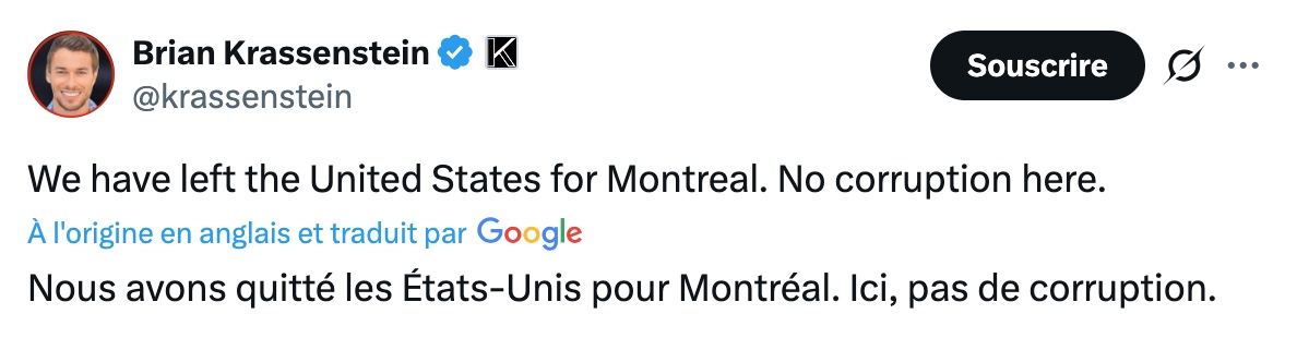 La récente publication de Brian Krassenstein sur la plateforme X a suscité une vague de réactions en ligne. Sur la photo partagée, on le voit souriant aux côtés de sa conjointe, dans un décor hivernal. Il accompagne l’image d’un message affirmant : « Nous avons quitté les États-Unis pour Montréal.