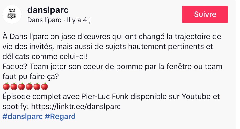 @danslparc À Dans l’parc on jase d’œuvres qui ont changé la trajectoire de vie des invités, mais aussi de sujets hautement pertinents et délicats comme celui-ci! Faque? Team jeter son coeur de pomme par la fenêtre ou team faut pu faire ça? 🍎🍎🍎🍎🍎🍎 Épisode complet avec Pier-Luc Funk disponible sur Youtube et spotify: https://linktr.ee/danslparc #danslparc #Regard ♬ original sound – Dans l’parc