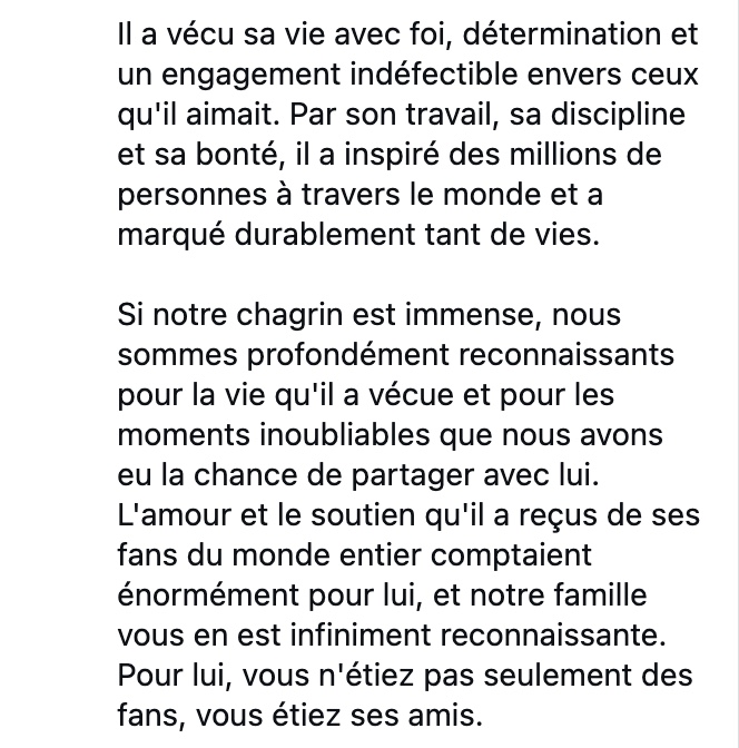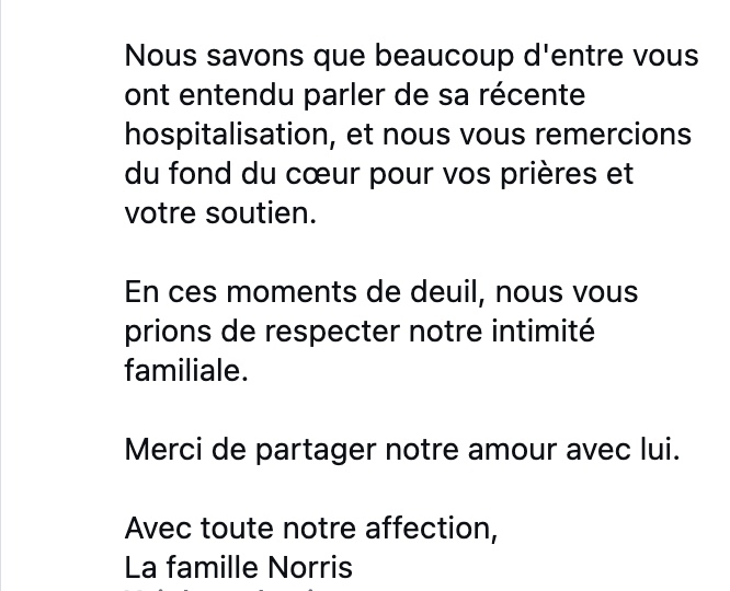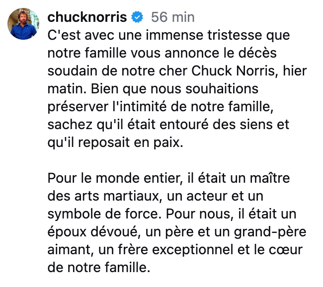 « C’est avec une profonde tristesse que nous vous informons du départ de notre cher Chuck Norris. Entouré de sa famille, il s’est éteint paisiblement », peut-on lire dans la publication, tout en demandant le respect de leur vie privée.