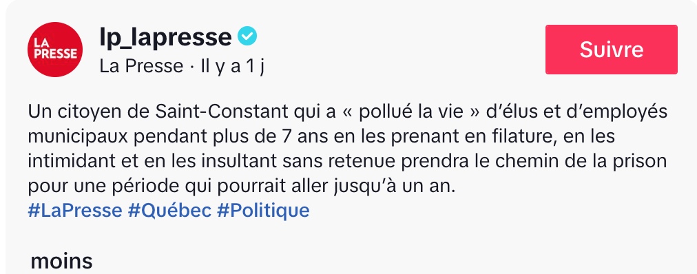 Un reportage diffusé par La Presse sur TikTok met en lumière une affaire troublante survenue à Saint-Constant, où un citoyen a mené, pendant plus de sept ans, une campagne d’intimidation soutenue contre des élus et des employés municipaux. Selon les informations présentées, cet individu a multiplié les comportements inquiétants : filatures, propos injurieux et gestes d’intimidation répétés, visant particulièrement certaines employées.