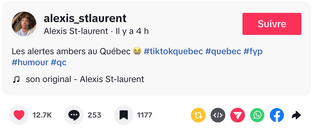 Dans une vidéo TikTok teintée d’ironie, Alexis s’adresse directement aux Québécois pour dénoncer, à sa manière, la multiplication des alertes Amber et leurs effets sur la population. Son intervention, volontairement exagérée, repose sur un contraste frappant : il reconnaît la gravité des enlèvements, mais questionne l’impact concret de ces notifications massives sur le quotidien des citoyens.