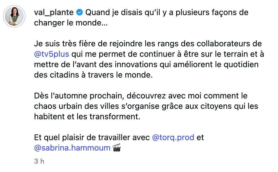 Après plusieurs mois de discrétion depuis son départ de la mairie de Montréal, Valérie Plante effectue un retour remarqué à la télévision. Dès l’automne, elle animera la nouvelle série Ça brasse en ville diffusée sur TV5, dans laquelle elle partira à la découverte de grandes villes aux prises avec des réalités urbaines complexes.