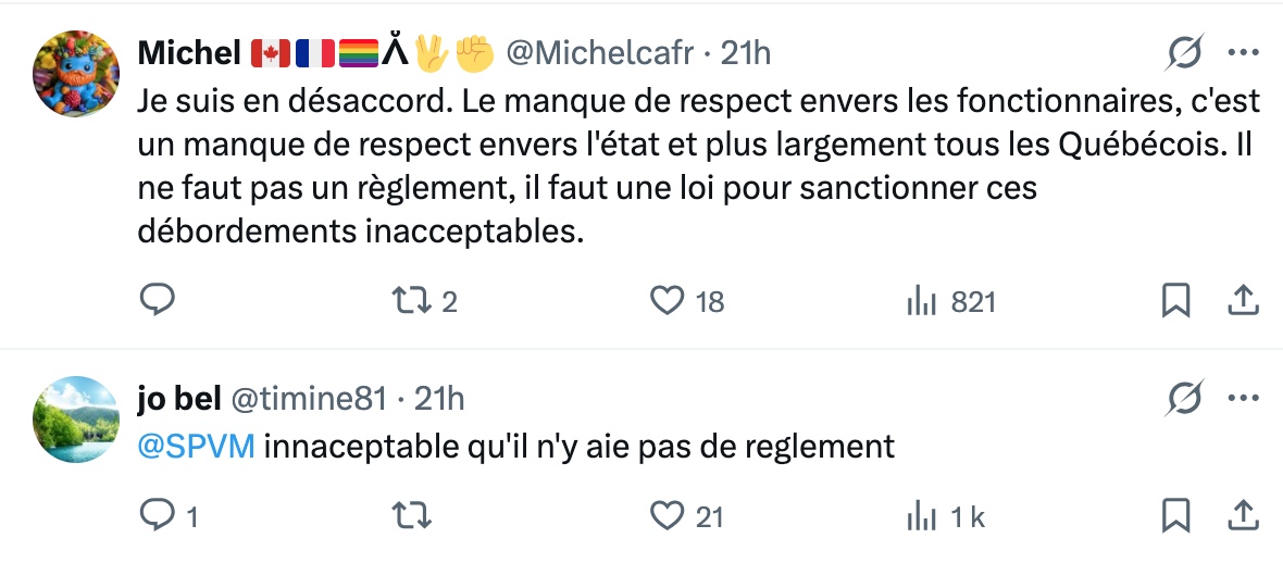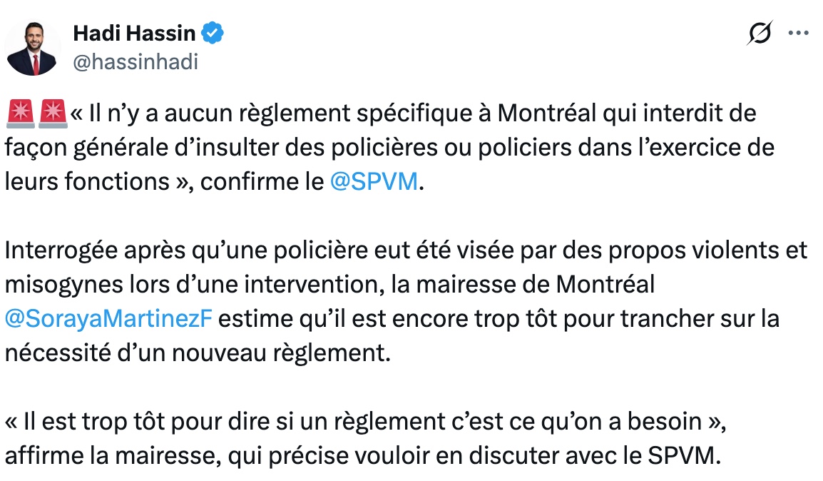 🚨🚨« Il n’y a aucun règlement spécifique à Montréal qui interdit de façon générale d’insulter des policières ou policiers dans l’exercice de leurs fonctions », confirme le @SPVM.