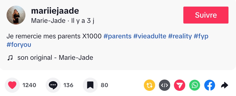 @mariiejaade Je remercie mes parents X1000 #parents #vieadulte #reality #fyp #foryou ♬ son original – Marie-Jade