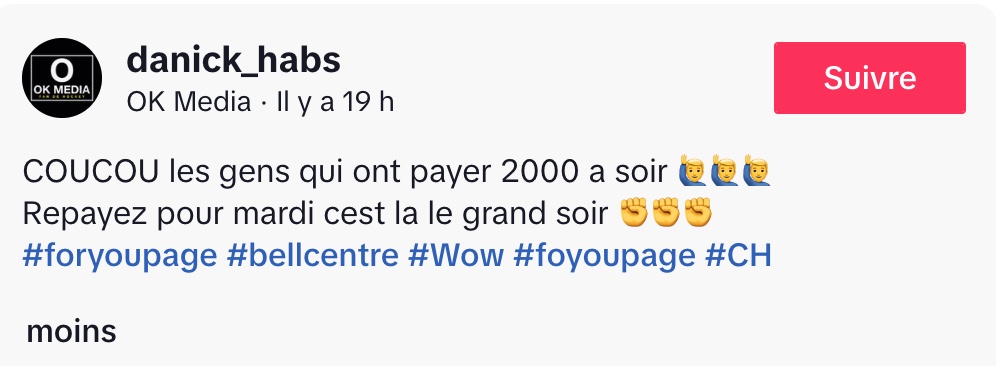 @danick_habs COUCOU les gens qui ont payer 2000 a soir 🙋♂️🙋♂️🙋♂️ Repayez pour mardi cest la le grand soir ✊✊✊ #foryoupage #bellcentre #Wow #foyoupage #CH ♬ son original – OK Media