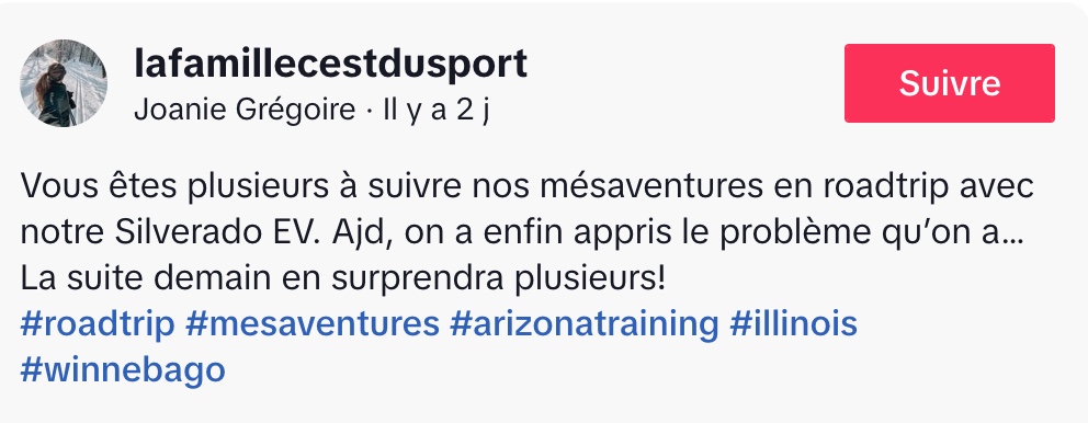 @lafamillecestdusport Vous êtes plusieurs à suivre nos mésaventures en roadtrip avec notre Silverado EV. Ajd, on a enfin appris le problème qu’on a… La suite demain en surprendra plusieurs! #roadtrip #mesaventures #arizonatraining #illinois #winnebago ♬ Whispering Harmony – MelodyLite