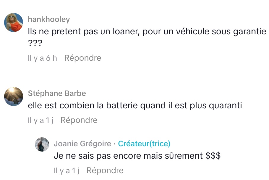 Dans son TikTok, Joanie raconte une situation frustrante et imprévue survenue lors de son voyage. Elle explique que leur véhicule rencontre un problème de batterie, ce qui les empêche de poursuivre leur périple. Après trois jours d’attente, ils apprennent que la batterie doit être complètement remplacée.
