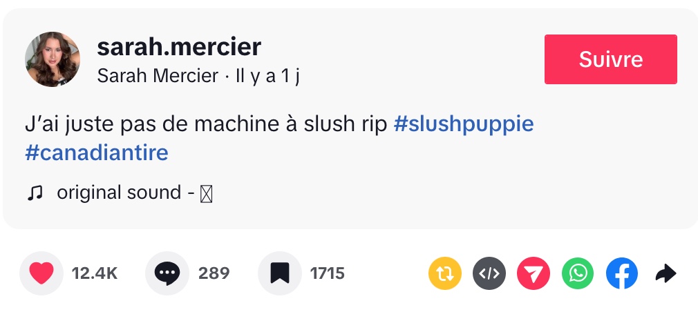 Dans une courte vidéo TikTok, Sarah partage avec enthousiasme une découverte qui semble tout droit sortie de ses rêves d’enfance : la possibilité d’acheter des saveurs de Slush Puppie chez Canadian Tire.
