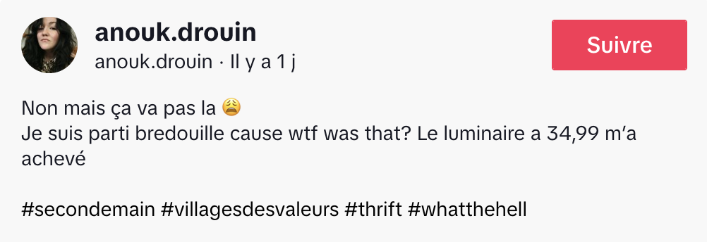 @anouk.drouin Non mais ça va pas la 😩 Je suis parti bredouille cause wtf was that? Le luminaire a 34,99 m’a achevé #secondemain #villagesdesvaleurs #thrift #whatthehell ♬ son original – anouk.drouin