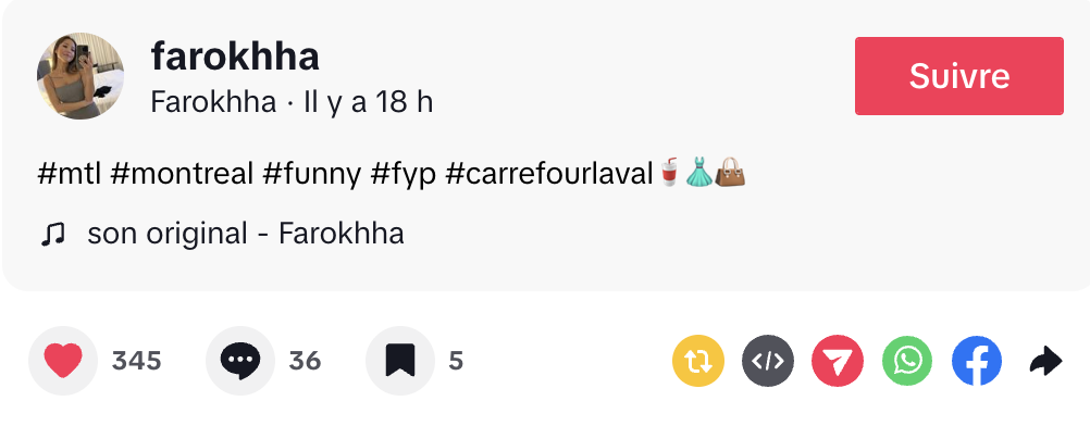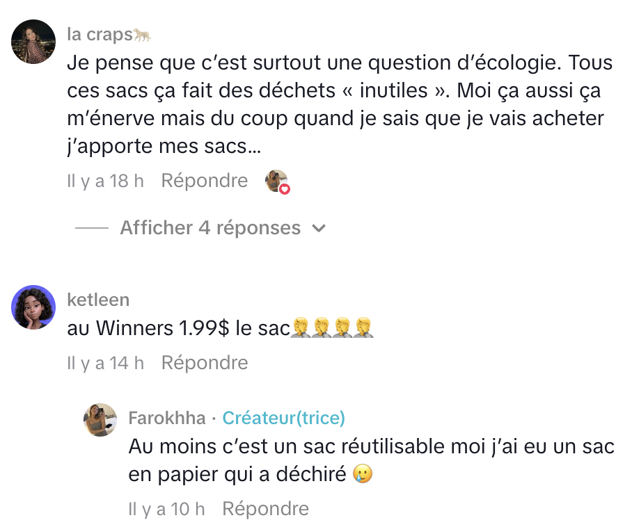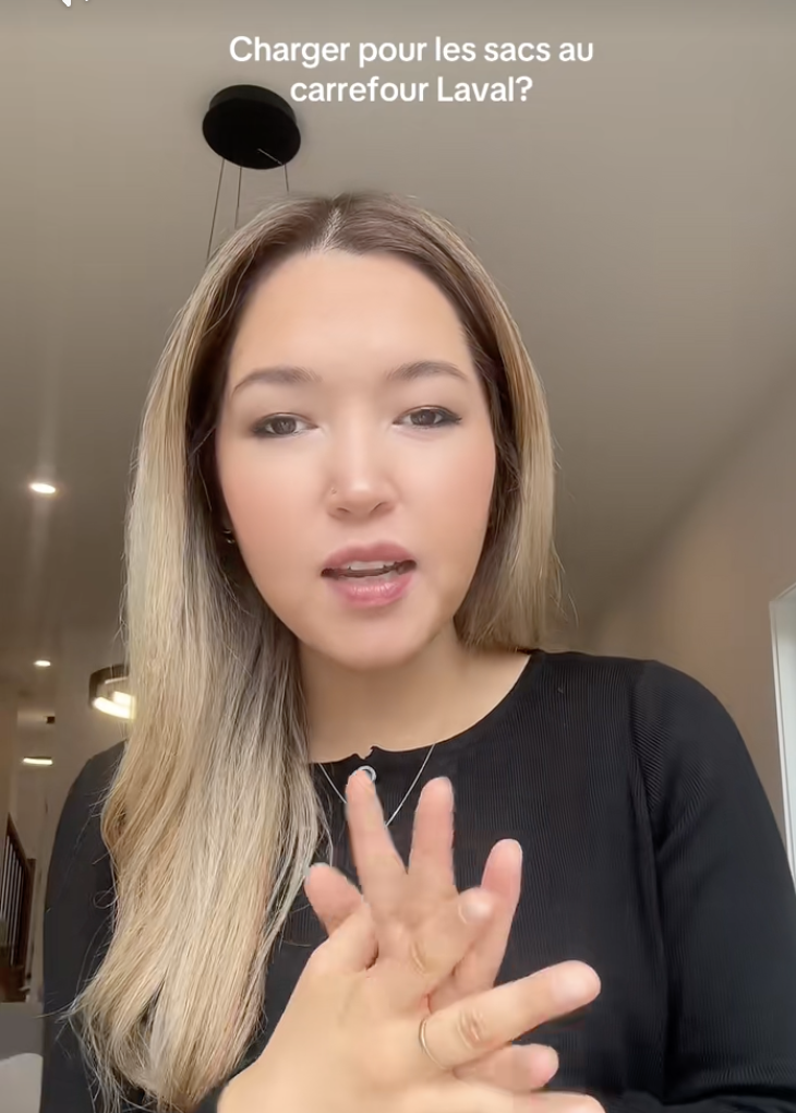Dans sa vidéo TikTok, Farokhha souligne avec un ton à la fois ironique et agacé une situation qu’elle juge absurde dans le commerce de détail actuel. Elle raconte avoir acheté un manteau dans un centre commercial, notamment au Carrefour Laval, et s’être fait demander 15 sous pour un sac.