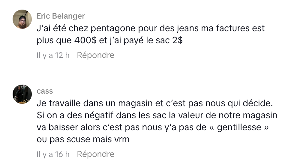 Même si le montant est minime, elle insiste sur le principe : lorsqu’un article coûte déjà près de 500 dollars, le fait de devoir payer pour un sac donne une impression de manque de considération envers le client. Selon elle, autrefois, un sac était automatiquement offert avec l’achat, peu importe le prix ou le type de produit.