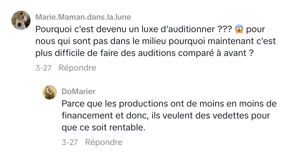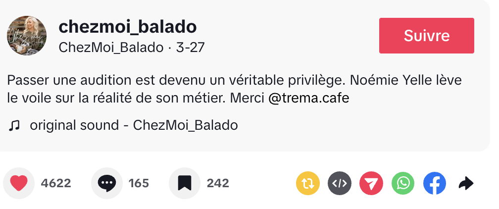 @chezmoi_balado Passer une audition est devenu un véritable privilège. Noémie Yelle lève le voile sur la réalité de son métier. Merci @trema.cafe ♬ original sound – ChezMoi_Balado