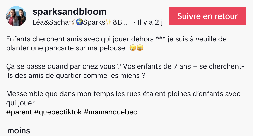 @sparksandbloom Enfants cherchent amis avec qui jouer dehors *** je suis à veuille de planter une pancarte sur ma pelouse. 🥲😄 Ça se passe quand par chez vous ? Vos enfants de 7 ans + se cherchent-ils des amis de quartier comme les miens ? Messemble que dans mon temps les rues étaient pleines d’enfants avec qui jouer. #parent #quebectiktok #mamanquebec ♬ son original – Léa&Sacha🤸🏻🌍Sparks✨&Bloom🌸