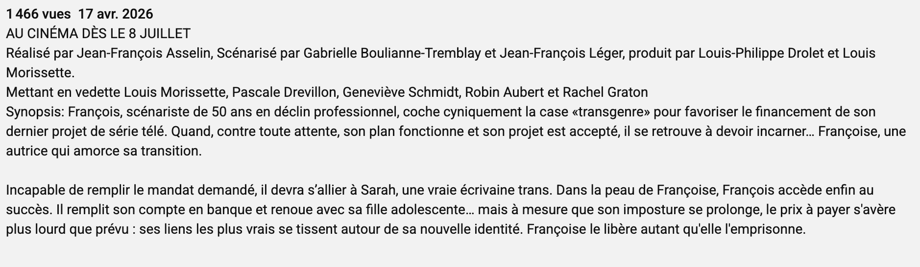 L’histoire suit François, un scénariste de 50 ans en perte de vitesse, prêt à tout pour relancer sa carrière. Dans un geste aussi opportuniste que risqué, il coche la case « transgenre » lors d’une demande de financement, espérant ainsi donner un coup de pouce à son projet. Contre toute attente, la stratégie fonctionne. Mais ce succès inattendu l’oblige à aller beaucoup plus loin que prévu : il doit désormais incarner Françoise, une autrice en pleine transition.