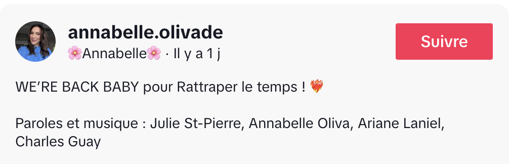 @annabelle.olivade WE’RE BACK BABY pour Rattraper le temps ! ❤️🔥 Paroles et musique : Julie St-Pierre, Annabelle Oliva, Ariane Laniel, Charles Guay Réalisation musicale/mixage : Cartier Préféré Mastering : Jean-Philippe Villemure Réalisation et photographie : @mathieusamsonofficiel Assistants : John De Minico, Xavier Gravel Montage : @carrissavales Graphisme : Jérémie Boisier Maquillage : Arianne Tremblay Coiffure : Andrew Gilbert Stylisme : Camille Internoscia Gérance et booking : @mathieu.caron Promotion : UN PAR UN #mixmania #quebec #comeback #francophone #musiquequebecoise ♬ son original – 🌸Annabelle🌸