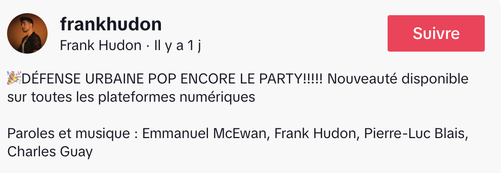 @frankhudon 🎉DÉFENSE URBAINE POP ENCORE LE PARTY!!!!! Nouveauté disponible sur toutes les plateformes numériques Paroles et musique : Emmanuel McEwan, Frank Hudon, Pierre-Luc Blais, Charles Guay Réalisation musicale/mixage : Cartier Préféré Mastering : Jean-Philippe Villemure Réalisation et photographie : @Mathieu Samson Assistants : John De Minico, Xavier Gravel Montage : @Carissa Vales Graphisme : Jérémie Boisier Maquillage : Arianne Tremblay Coiffure : Andrew Gilbert Stylisme : Camille Internoscia Gérance et booking : @Mathieu Caron Promotion : UN PAR UN #mixmania #mixmania1 ♬ son original – Frank Hudon