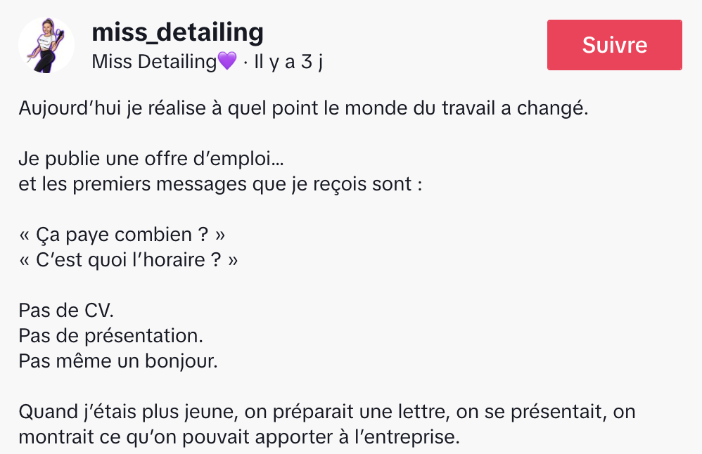 @miss_detailing Aujourd’hui je réalise à quel point le monde du travail a changé. Je publie une offre d’emploi… et les premiers messages que je reçois sont : « Ça paye combien ? » « C’est quoi l’horaire ? » Pas de CV. Pas de présentation. Pas même un bonjour. Quand j’étais plus jeune, on préparait une lettre, on se présentait, on montrait ce qu’on pouvait apporter à l’entreprise. Aujourd’hui j’ai l’impression que plusieurs arrivent déjà avec une liste d’exigences… avant même d’avoir montré leur valeur. Entrepreneurs, dites-moi : est-ce que vous trouvez ça difficile de recruter vous aussi ? #entrepreneuriat #recrutement #businessquebec #entrepreneurfeminin #entrepreneur ♬ son original – Miss Detailing💜