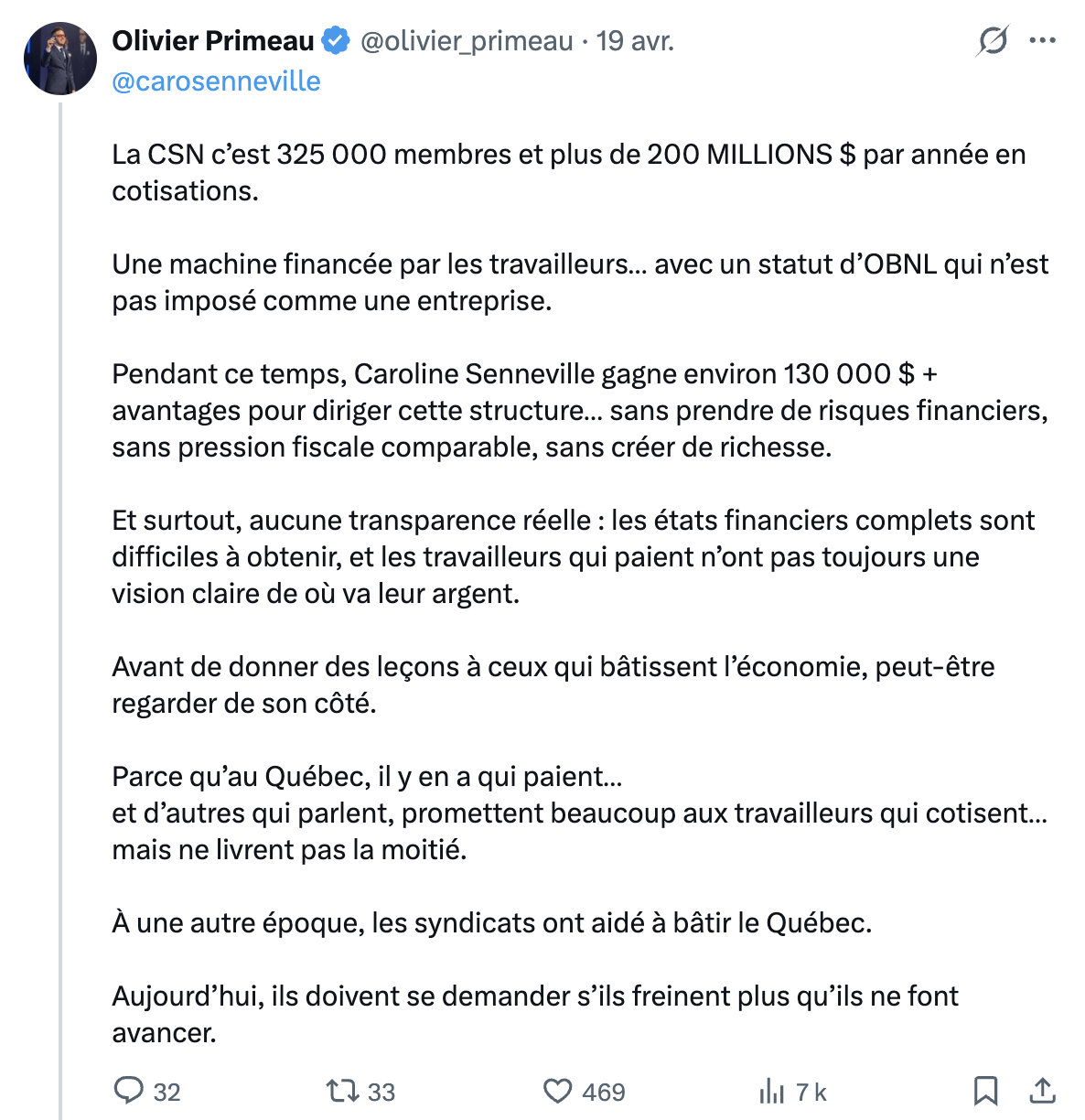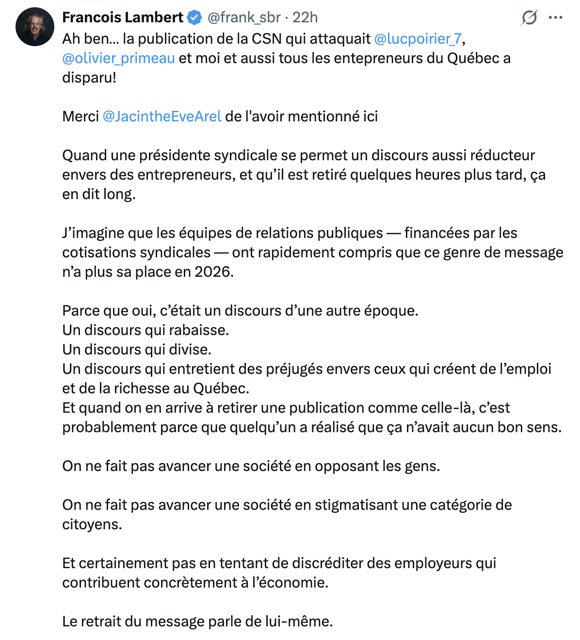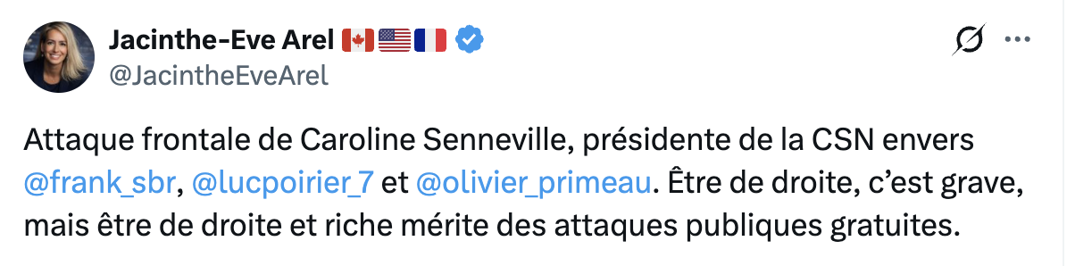 Attaque frontale de Caroline Senneville, présidente de la CSN envers @frank_sbr, @lucpoirier_7 et @olivier_primeau. Être de droite, c’est grave, mais être de droite et riche mérite des attaques publiques gratuites. pic.twitter.com/6vX5A18JA8