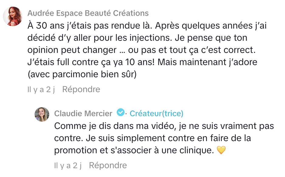 La vidéo, largement partagée, a rapidement fait réagir le public. Face à l’ampleur des commentaires, Claudie a publié une seconde capsule afin de préciser sa pensée. Avec un ton à la fois ironique et direct, elle explique qu’elle n’a jamais voulu s’associer à une clinique ni promouvoir ce type de démarches médicales. Elle insiste sur le fait que, même si chacun est libre de faire des choix personnels comme recourir au botox ou à la chirurgie, elle s’oppose fermement aux partenariats promotionnels avec des établissements à l’étranger qui minimisent les risques réels pour la santé.