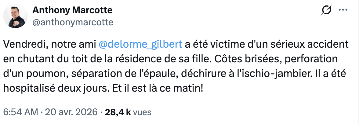Le journaliste Anthony Marcotte, animateur à la radio BPM dans la même émission matinale que Gilbert Delorme, a récemment publié deux messages marquants qui ont suscité beaucoup de réactions. Dans ces publications, il revient sur un événement troublant survenu vendredi dernier, alors que son collègue et ami a été victime d’un grave accident.