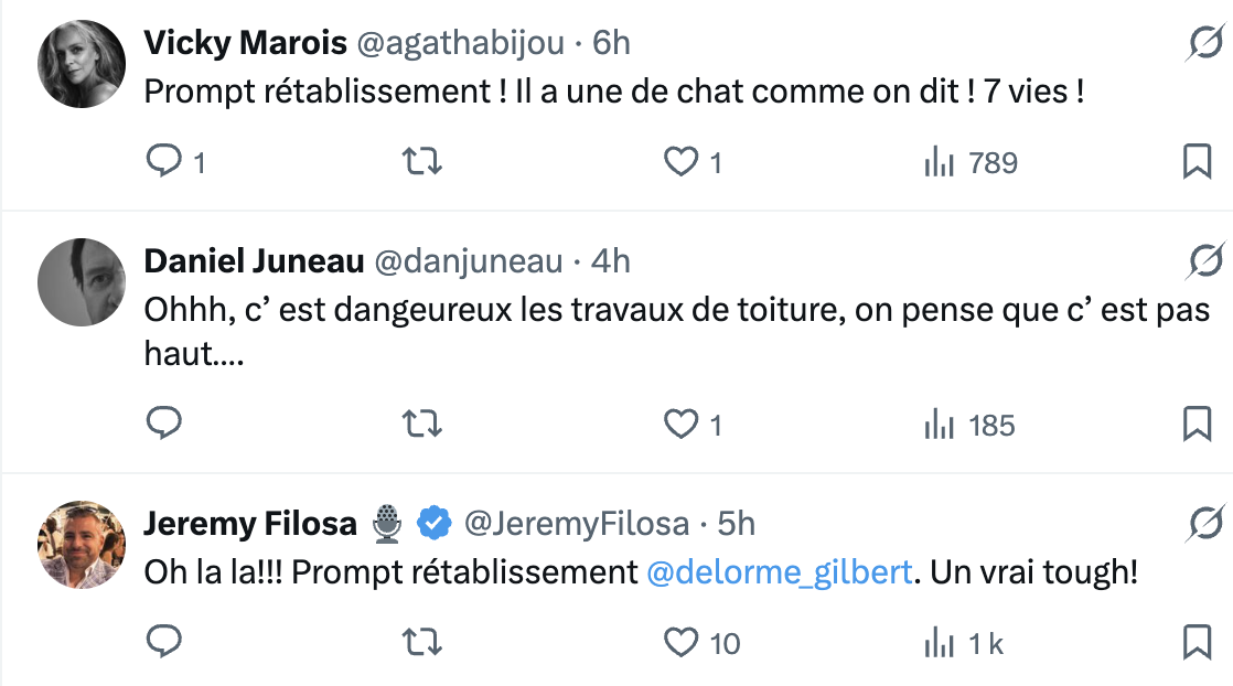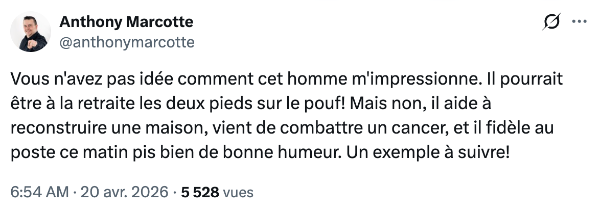 Ce qui frappe particulièrement dans les deux publications d’Anthony Marcotte, c’est le ton admiratif et profondément humain qu’il emploie pour parler de son collègue. Dans son message, il souligne non seulement la résilience physique de Gilbert Delorme, mais aussi son attitude face aux épreuves. Marcotte écrit notamment qu’il est impressionné par cet homme qui, malgré tout ce qu’il traverse, continue d’être présent à la radio dès le matin, avec bonne humeur et détermination.