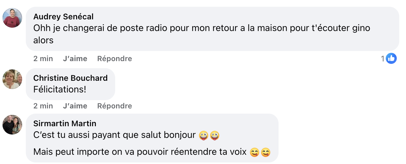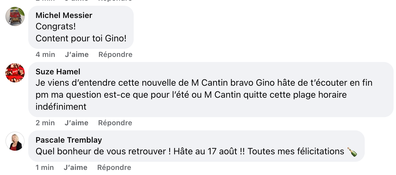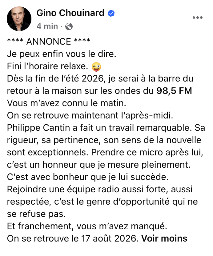 Dans un communiqué, il a d’ailleurs souligné la capacité de Gino Chouinard à établir un lien solide avec l’auditoire, tout en traitant l’actualité avec sérieux, sensibilité et intelligence.