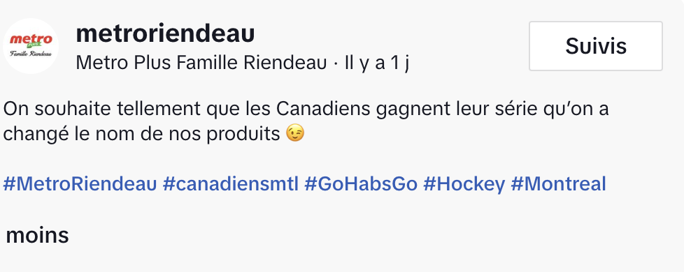 @metroriendeau On souhaite tellement que les Canadiens gagnent leur série qu’on a changé le nom de nos produits 😉 #MetroRiendeau #canadiensmtl #GoHabsGo #Hockey #Montreal ♬ Goal – ROKKA