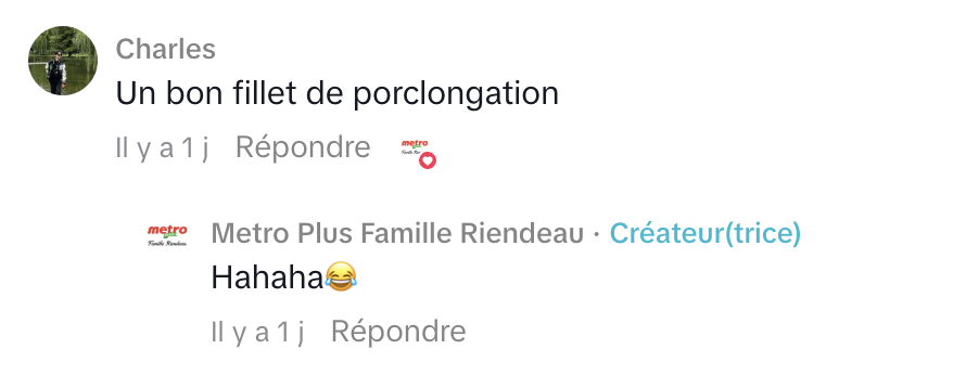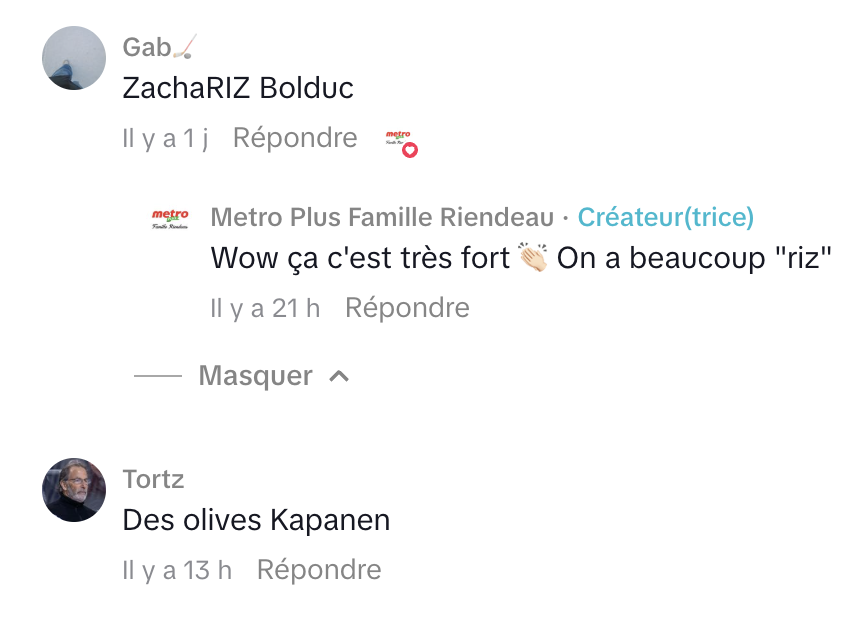 Ce qui rend l’initiative encore plus intéressante, c’est la réaction du public. Sur le web, les commentaires sont largement positifs. Les internautes embarquent dans le jeu, proposant à leur tour leurs propres jeux de mots. Une véritable chaîne de créativité s’installe, preuve que ce genre de contenu rassemble et divertit. Metro Famille Riendeau devient ainsi bien plus qu’une simple épicerie : un lieu d’échange et de plaisir collectif.