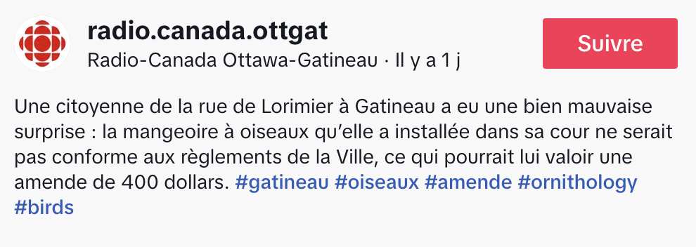 @radio.canada.ottgat Une citoyenne de la rue de Lorimier à Gatineau a eu une bien mauvaise surprise : la mangeoire à oiseaux qu’elle a installée dans sa cour ne serait pas conforme aux règlements de la Ville, ce qui pourrait lui valoir une amende de 400 dollars. #gatineau #oiseaux #amende #ornithology #birds ♬ Lo-Fi Hip-Hop Chic Calmness(1415020) – Kimochi Timbre