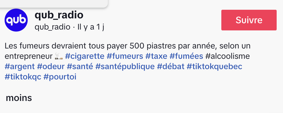 @qub_radio Les fumeurs devraient tous payer 500 piastres par année, selon un entrepreneur 🚬 #cigarette #fumeurs #taxe #fumées #alcoolisme #argent #odeur #santé #santépublique #débat #tiktokquebec #tiktokqc #pourtoi ♬ son original – qub_radio