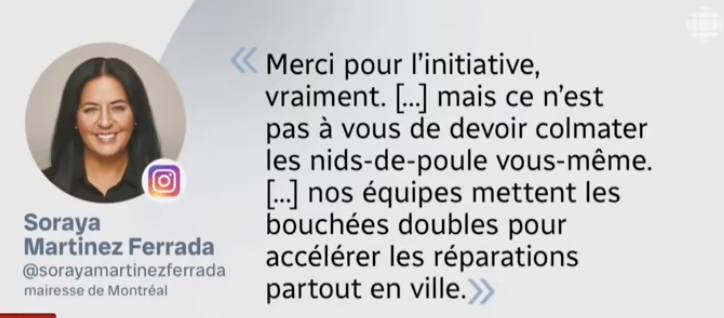 Ce cas met en lumière une réalité bien montréalaise : l’impatience grandissante des citoyens face aux infrastructures dégradées. Entre engagement citoyen et responsabilités municipales, la ligne devient floue. L’initiative de Marquize, aussi louable soit-elle, soulève une question essentielle : jusqu’où les citoyens doivent-ils aller pour compenser les lacunes perçues des services publics?